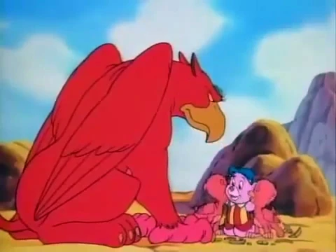 Als nun die Mutter zu ihrem Gelege zurückkehrt, findet sie dort zwei Junge und Cubbi vor, den sie fälschlicherweise für ihr drittes Küken hält und ihn sogar gegen Gruffi verteidigt. Der hat sich zwischenzeitlich dem dritten Greifjungen angenommen und versucht nun, es wieder zu seiner Mutter zu bringen. Sie hat aber Cubbi und ihre zwei Jungen auf einem kaum erreichbaren Felsvorsprung abgesetzt und will nun allen Dreien das Fliegen beibringen. Dazu stößt sie letztlich auch Cubbi über den Rand in die Tiefe.
