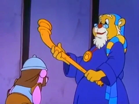 Er schlägt Cubbi ob seines mutigen EInsatzes gegen eine Bande von Ungeheuern für einen Tag zum Ritter von Gummadoon.